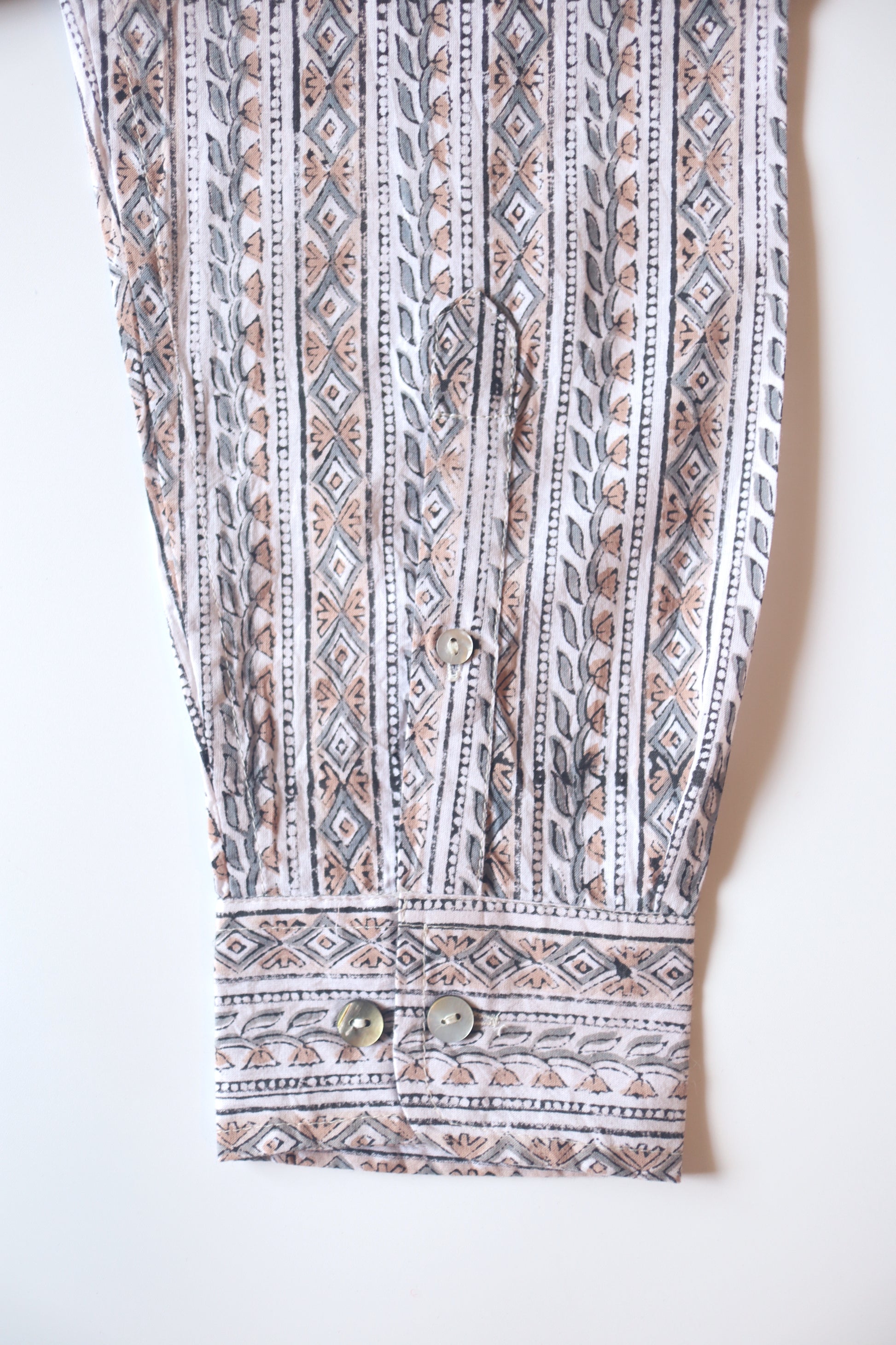 コットン100%で肌触り抜群。手作業の温もりがこもったブロックプリントのロングスリーブシャツ。細かなお花と葉っぱ、幾何学模様がかわいい。近くで見れば見るほど、柄の繊細さに惚れ惚れしてしまうシャツです。